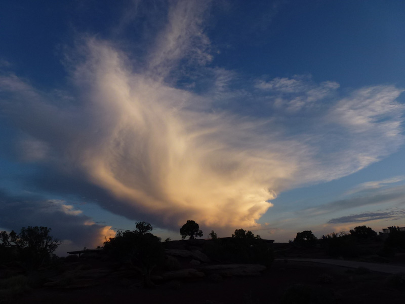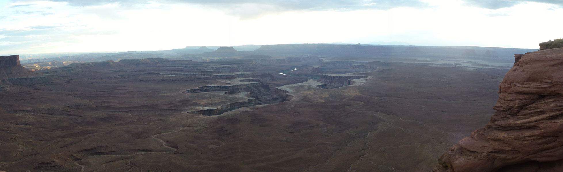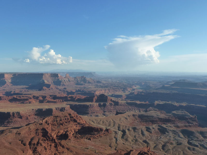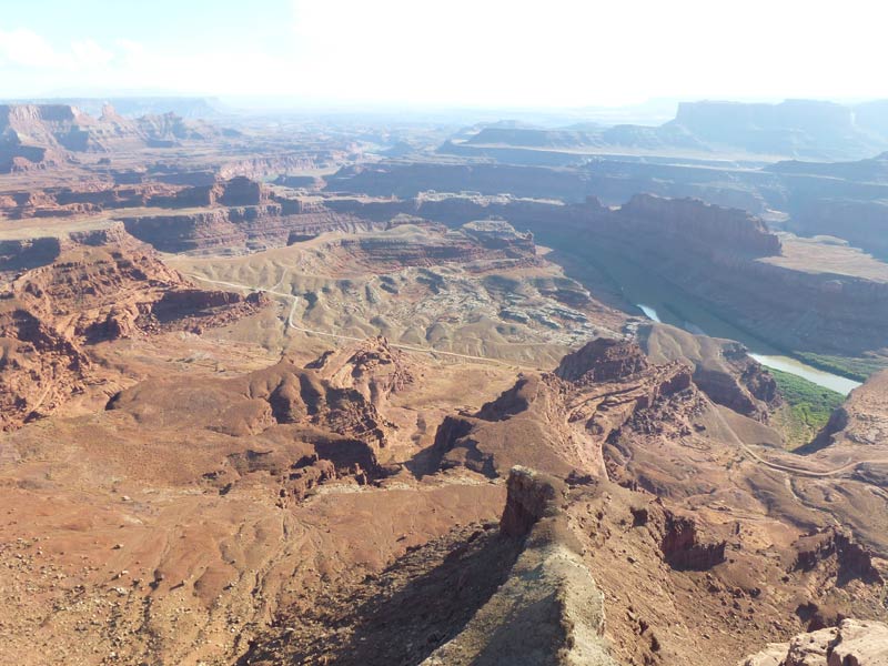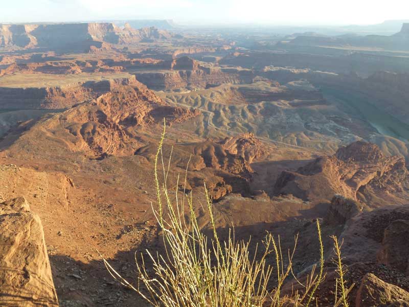 Dead Horse Point Statepark, Auf dem Hochplateau, im Distrikt Island in the Sky, können über die aspaltierte Parkstrasse, mehrere Aussichtspunkte (Grand View Point Overlook) und für Wohnmobile geeignete Campingplätze, angefahren werden. Eine Stichstrasse führt zum Statepark, Dead Horse Point und weiter zum Dead Horse Point Overlook der sich auf einem Hochplateau mit schmalem Zugang über den Colorado River befindet. Mehrere Legenden ranken sich um den Namen Dead Horse Point. Die wahrscheinlichste ist, dass Viehdiebe, Pferde und Rinder auf das Ende des Plateaus trieben, dort war es einfach den schmalen Grad abzusperren. Nur die verkauffähigen Tiere wurden mitgenommen, die restlichen Tiere wurden ihrem Schicksal überlassen und verdursteten auf der wasserlosen Hochebene. |
