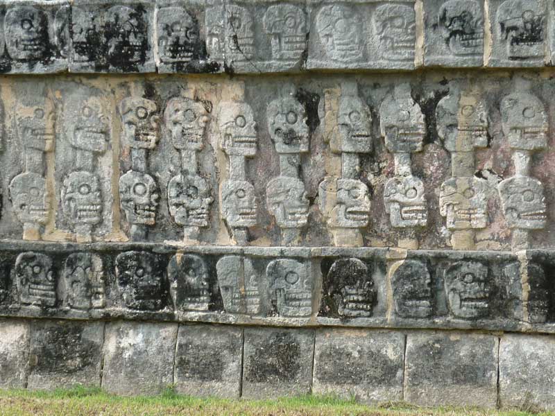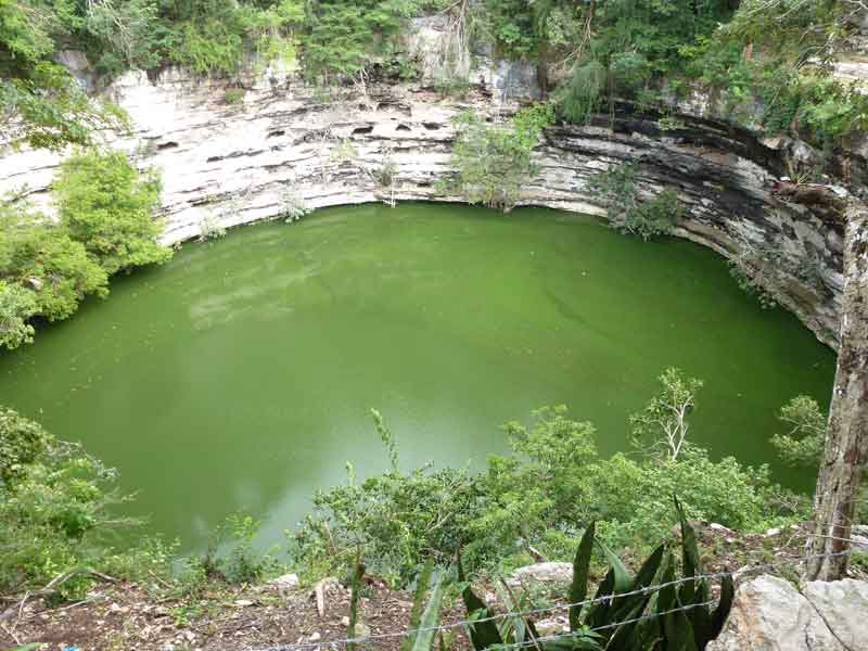 Die weitläufige Tempelanlage, Chichén Itzá , ist einer der schönsten Mayastätte in Mexiko. Durch die Nähe zur Rivera Maya, wird sie natürlich entsprechend besucht. Die große Pyramide, mit ihren 91 Stufen ist der Mittelpunkt der Anlage. Neben einer Säulenhalle, wurde hier schon Astronomie in einem Observatorium betrieben. Yucatan, besteht aus einem riesigen Kalkkessel, der so vermutet man, durch einen Meteoriteneinschlag gebildet wurde. Regenwasser sickert durch das poröse Gestein, unterirdische Flüsse leiten das Wasser in das Meer. Durch Einsturz der Kalkdecke werden tiefe Wasserlöcher gebildet, man vermutet daher im Yucatan, einer der weltgrößten Höhlensysteme im Kalkstein. Diese wurden von den Mayas als Operstätte genutzt, in dem Cenote von Chichen Itza, wurden mehrere menschliche Skelette gefunden. |