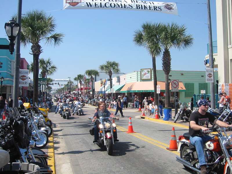 In Daytona, findet um diese Jahreszeit das zweitgrößte Bikertreffen neben Sturgis in South Dakota, der Welt, statt. Eine Woche lebt der Ort im Ausnahmezustand, jede Unterkunft oder freie Fläche, wird an zahlende Kunden vermietet. Vorgärten/Garagen dienen als Fläche für Shops die alles für Biker bereitstellen. Streng ist das promenieren mit dem Motorrad auf der Mainstreet. Wheelie oder sonstige gefährliche Stunts werden sofort geahndet, so geht es trotz der tausende von Biker gesittet zu. |