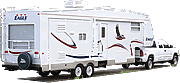 | Da es für viele Amerikaner normal ist, im Rentenalter alles zu verkaufen und in einem Wohnmobil oder Anhänger zu leben (Full-Timers) wird die Flexibilität durch ein im Schlepptau befindliches Auto (Towing Car) gewährleistet. Durch einfache aber wirkungsvolle Maßnahmen wird über eine Triangel–Konstruktion (Towing Hitch) das Zweitauto mitgeführt. Leider wird diese sinnvolle Einrichtung ebenfalls durch unsinnige Bestimmungen in Europa verhindert. Im Gegensatz zu Europa, wo Aktiv-Elektrische Bremssysteme unbekannt oder durch TÜV Auflagen unbezahlbar sind, werden in Amerika ausschließlich elektromagnetische Bremssysteme (Elektromagnete in den Bremsnaben ersetzen die Bremshydraulikzylinder) bei Anhängern verwendet. Durch elektronische Bremskontrolle im Zugfahrzeug werden Bremsvorgänge proportional zum Zugfahrzeug eingeleitet. Im Gegensatz zu unseren Auflaufbremssystemen wird damit ein viel feinfühligeres Bremsverhalten mit vorauseilender Bremseinleitung ermöglicht. |